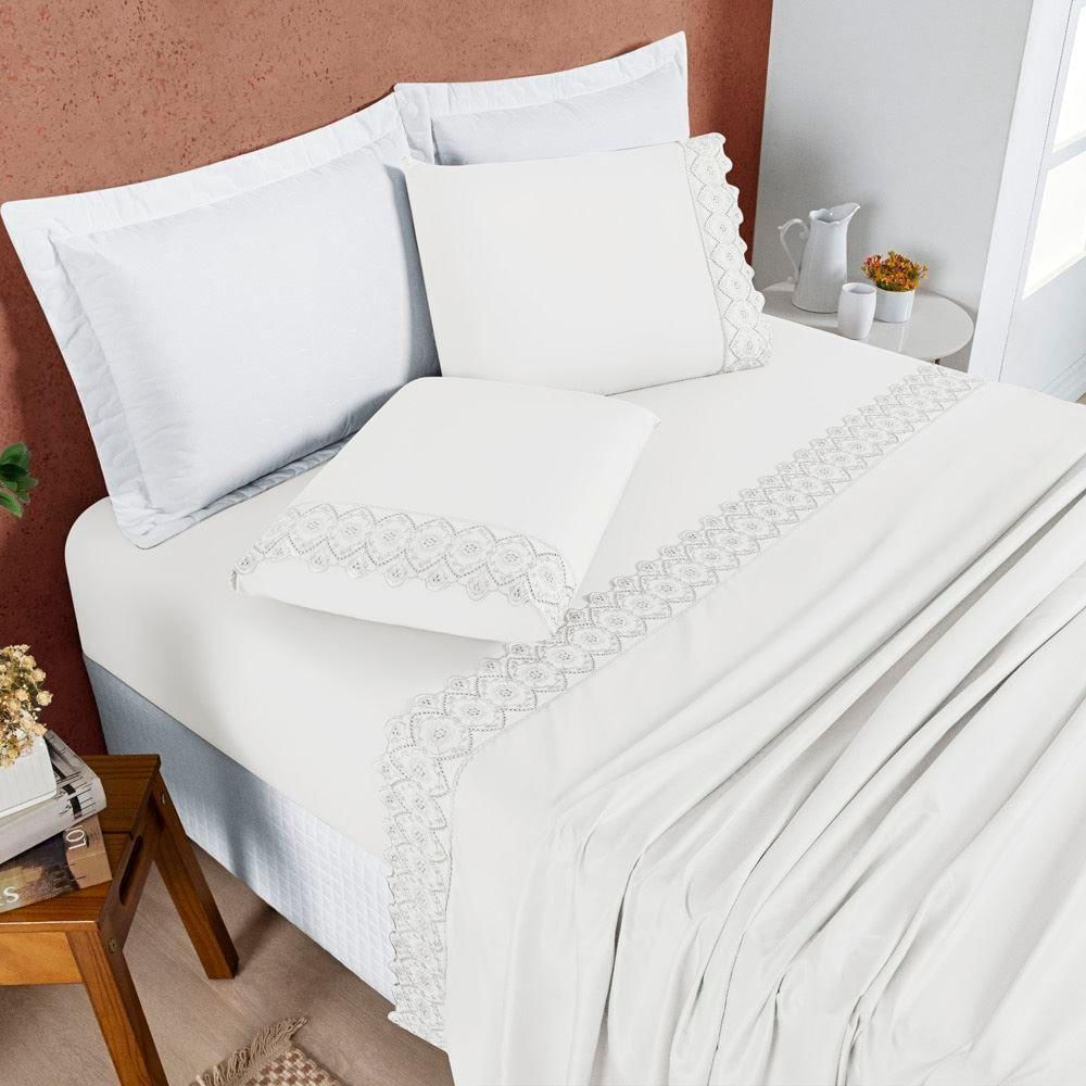 Tecido: Micropercal 200 fios com detalhe em bordado inglês nas fronhas e no lençol de cima Composição: Tecido superior e inferior: 100% Poliéster