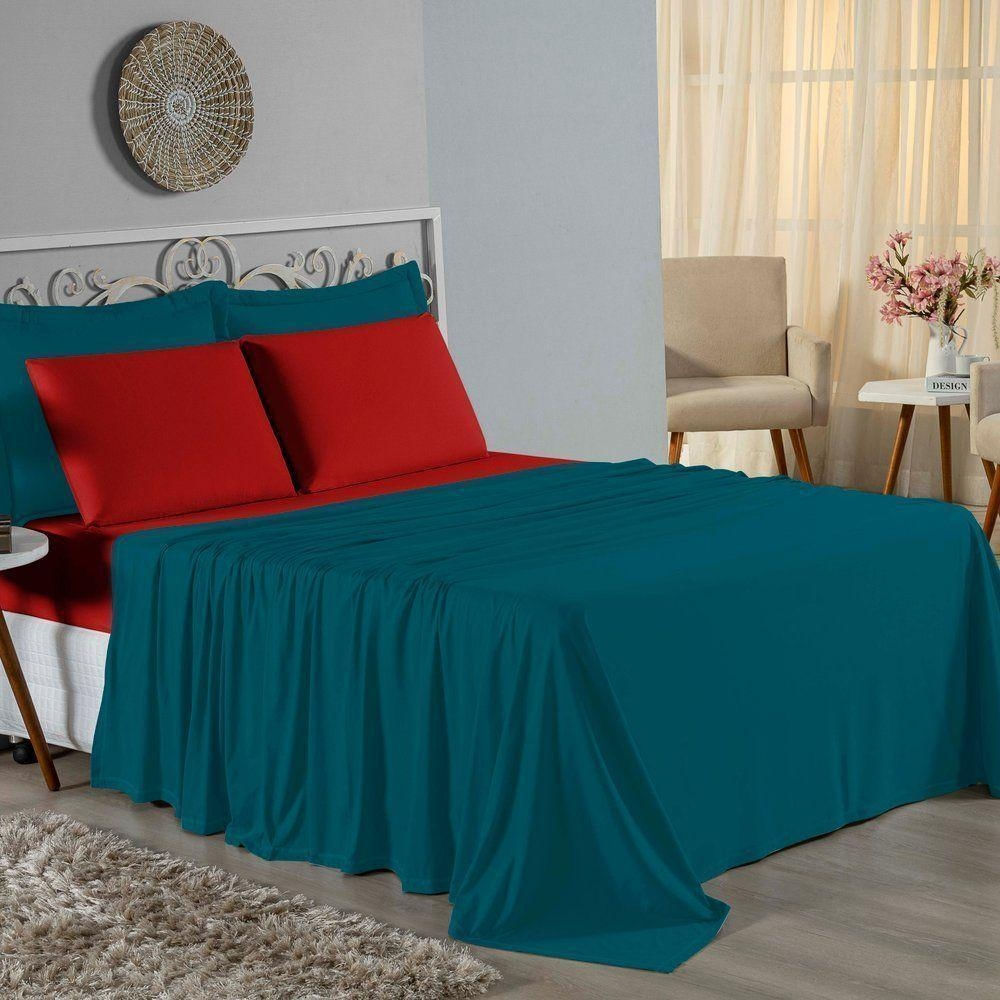 Jogo De Cama Solteiro Nobre 3 Peças Lençol Com Elástico De 30cm De Altura Malha 100% Algodão - Petróleo / Vermelho