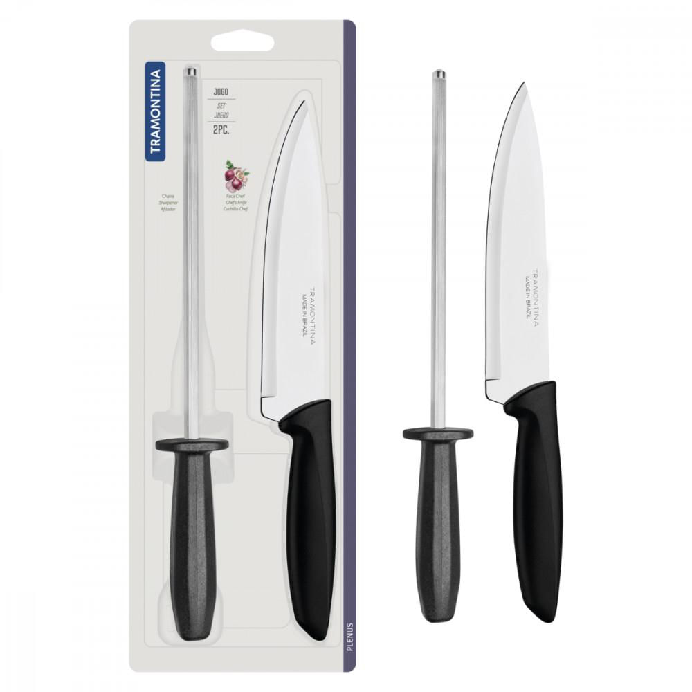 Jogo de Faca com Chaira Tramontina Plenus com Laminas em Aço Inox e Cabos de Polipropileno Preto 2 Peças