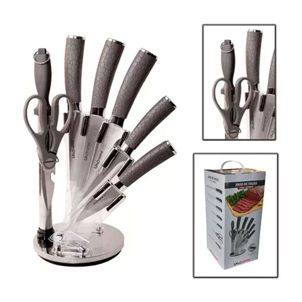 Jogo de Facas Inox Cabo Ergonômico Texturizado 7 Peças e Suporte Giratório Linha Premium