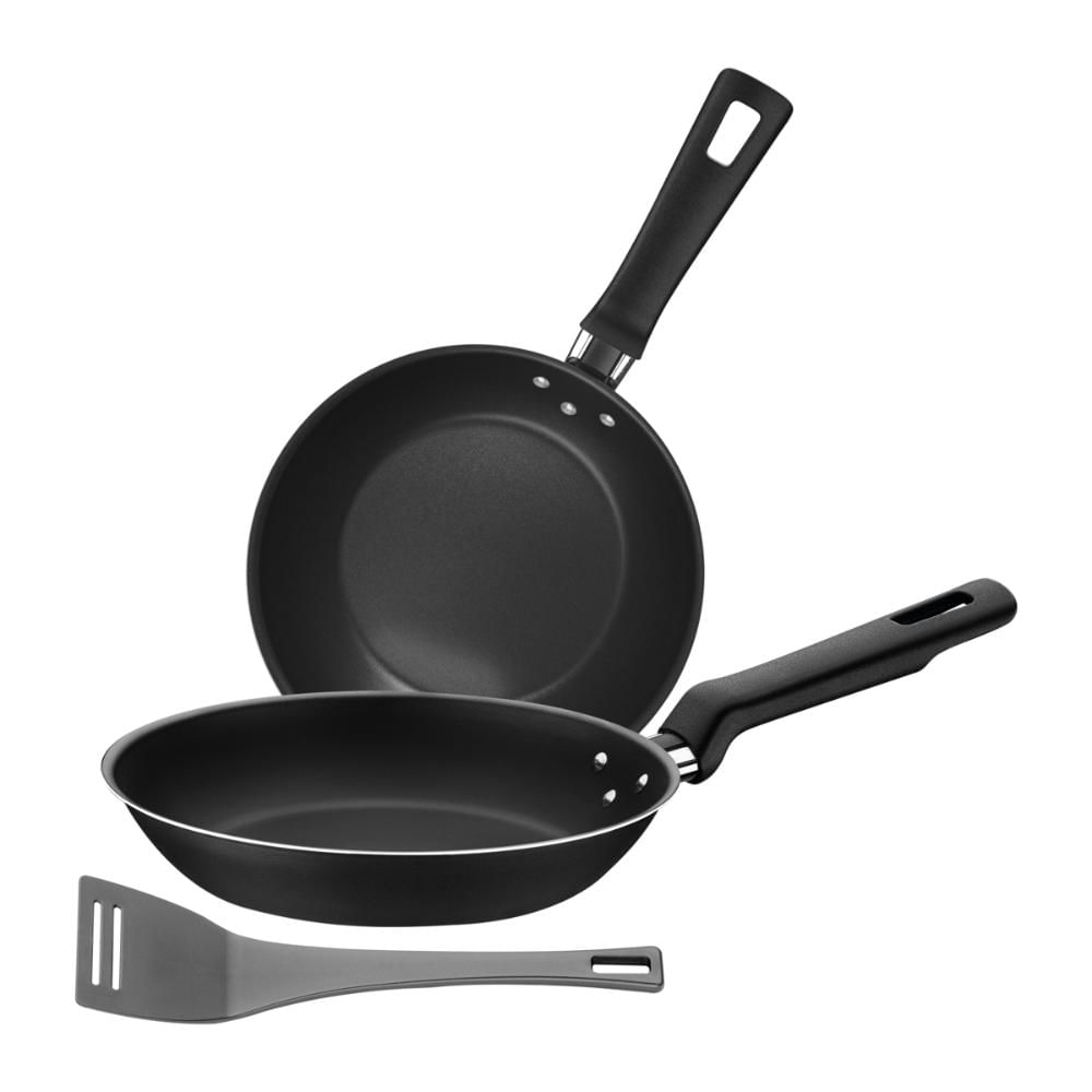 O Jogo de Frigideiras Tramontina Loreto em Alumínio com Revestimento Interno e Externo Antiaderente Starflon T1 com Cabos Baquelite Grafite 3 Peças é a escolha certa para sua cozinha! As duas frigideiras são produzidas em alumínio, que proporciona um cozimento rápido e uniforme dos alimentos, devido sua espessura. Seu revestimento interno e externo antiaderente Starflon T1 possui alto poder de antiaderência e ainda garante maior resistência à abrasão, prolongando sua vida útil em 5.000 ciclos. Para dar mais segurança no manuseio, os cabos são produzidos em baquelite antitérmico, que não esquenta e evita queimaduras. Além disso, acompanha uma espátula para lhe auxiliar nas mais diversas receitas. É um jogo essencial em sua cozinha, pois é resistente, durável e prático, podendo ir à máquina de lavar louças todos os dias. Garanta já o seu e tenha momentos inesquecíveis na cozinha!