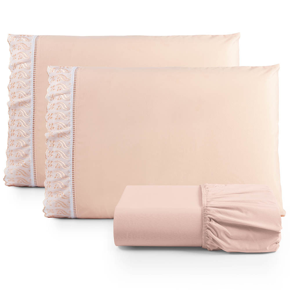 Jogo de Lençol Casal 3 Peças Basic Percal 180 Fios Lese Bordado Inglês - Salmão