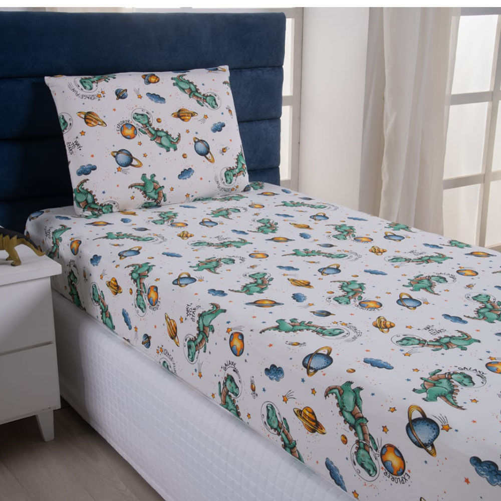 Jogo de Lençol Fantasy Infantil Solteiro 02 Peças Malha 100% Algodão - Dinossauro Astronauta