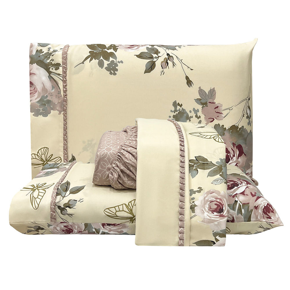 Jogo de Lençol Lislie Casal 4 Peças MicroPercal 300 Fios Estampado Floral - Buque Rosê - 100% Poliéster