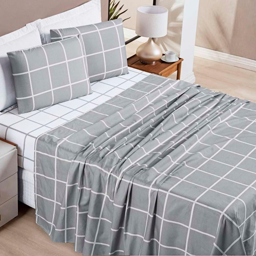 Jogo De Lençol Minimalista Queen 4 Peças Percal 200 Fios Quadriculado - Cinza - 100% Poliéster