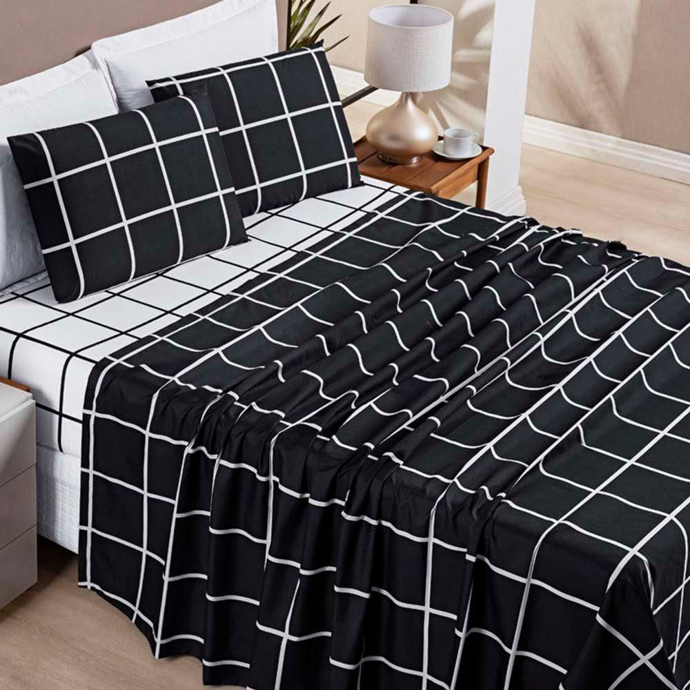 Jogo De Lençol Minimalista Queen 4 Peças Percal 200 Fios Quadriculado - Preto - 100% Poliéster