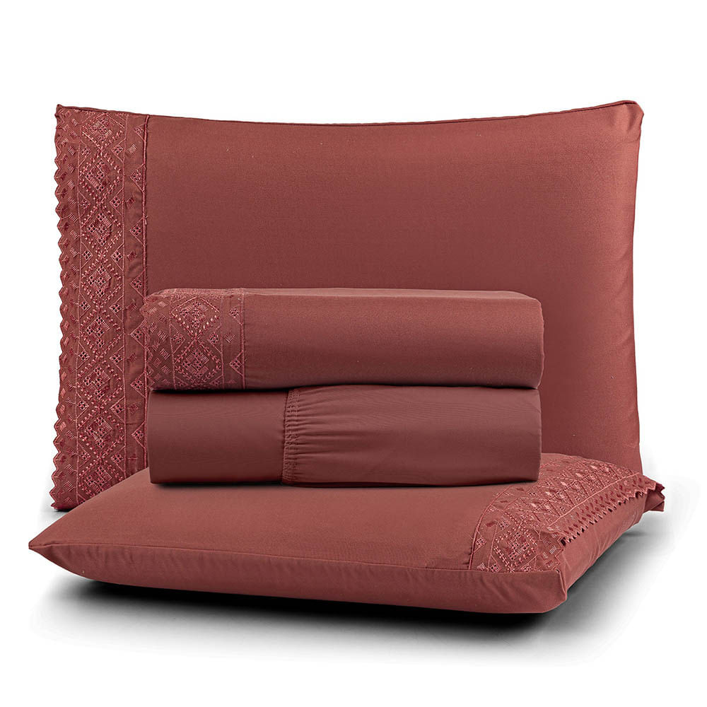 Jogo de Lençol Nobre Casal 4 Peças MicroPercal 200 Fios Bordado Inglês Fino - Canela - 100% Poliéster