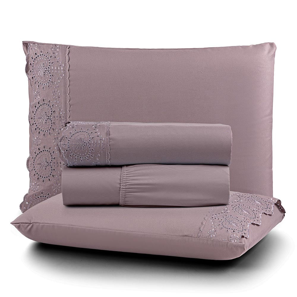 Jogo de Lençol Nobre Casal 4 Peças MicroPercal 200 Fios Bordado Inglês Fino - Frape Uva - 100% Poliéster