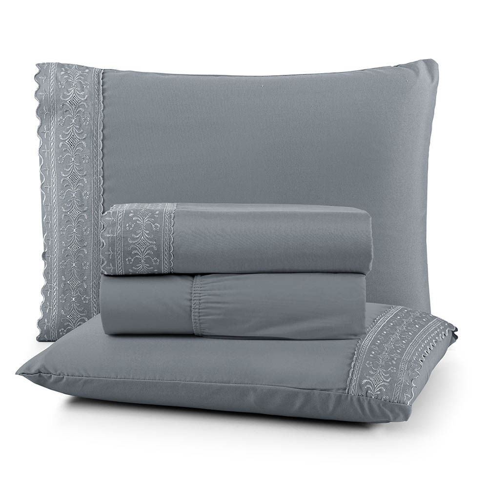 Jogo de Lençol Nobre Solteiro 3 Peças MicroPercal 200 Fios Bordado Inglês Fino - Cinza - 100% Poliéster