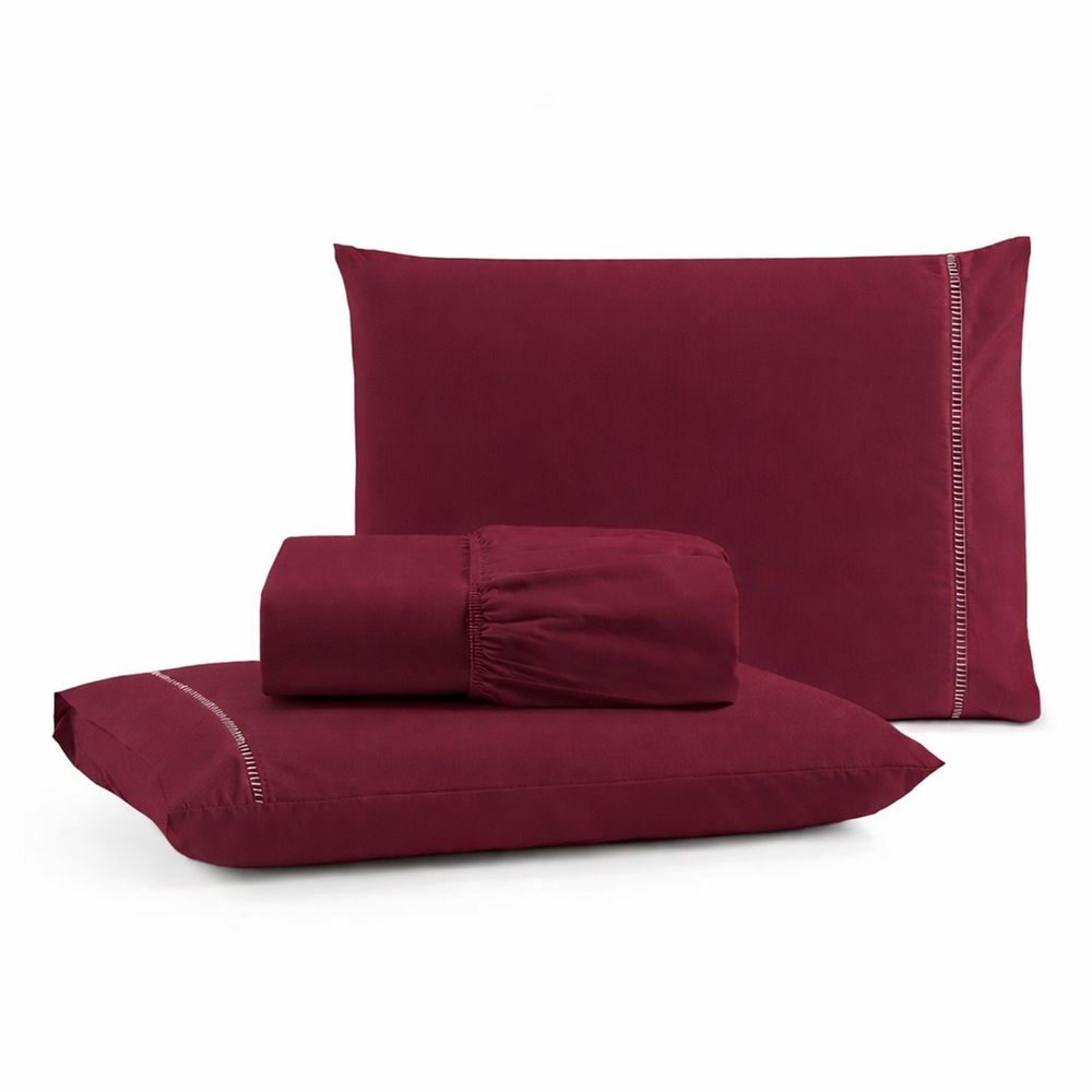 Jogo de Lençol Queen Premium Soft 600 Fios Micropercal Bordô Ponto Palito Toque Macio 3 Peças