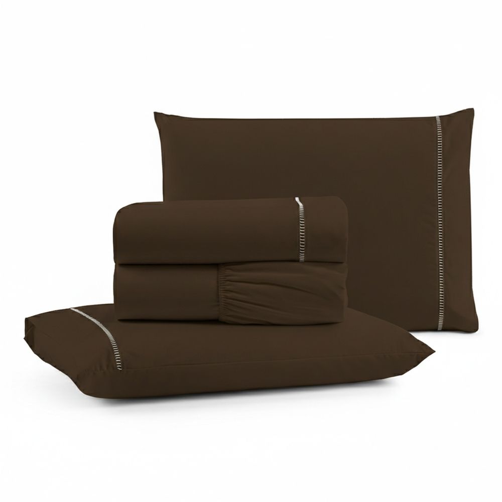 Jogo de Lençol Queen Premium Soft 600 Fios Micropercal Marrom Ponto Palito Toque Macio 4 Peças