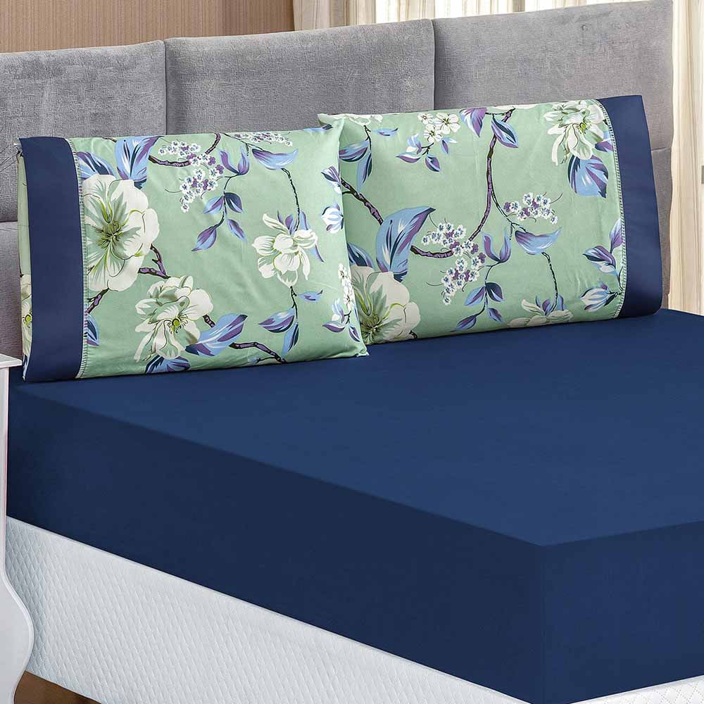 Jogo de Lençol Real Casal Padrão 3 Peças MicroPercal 200 Fios Ponto Palito Estampado - Azul Flower