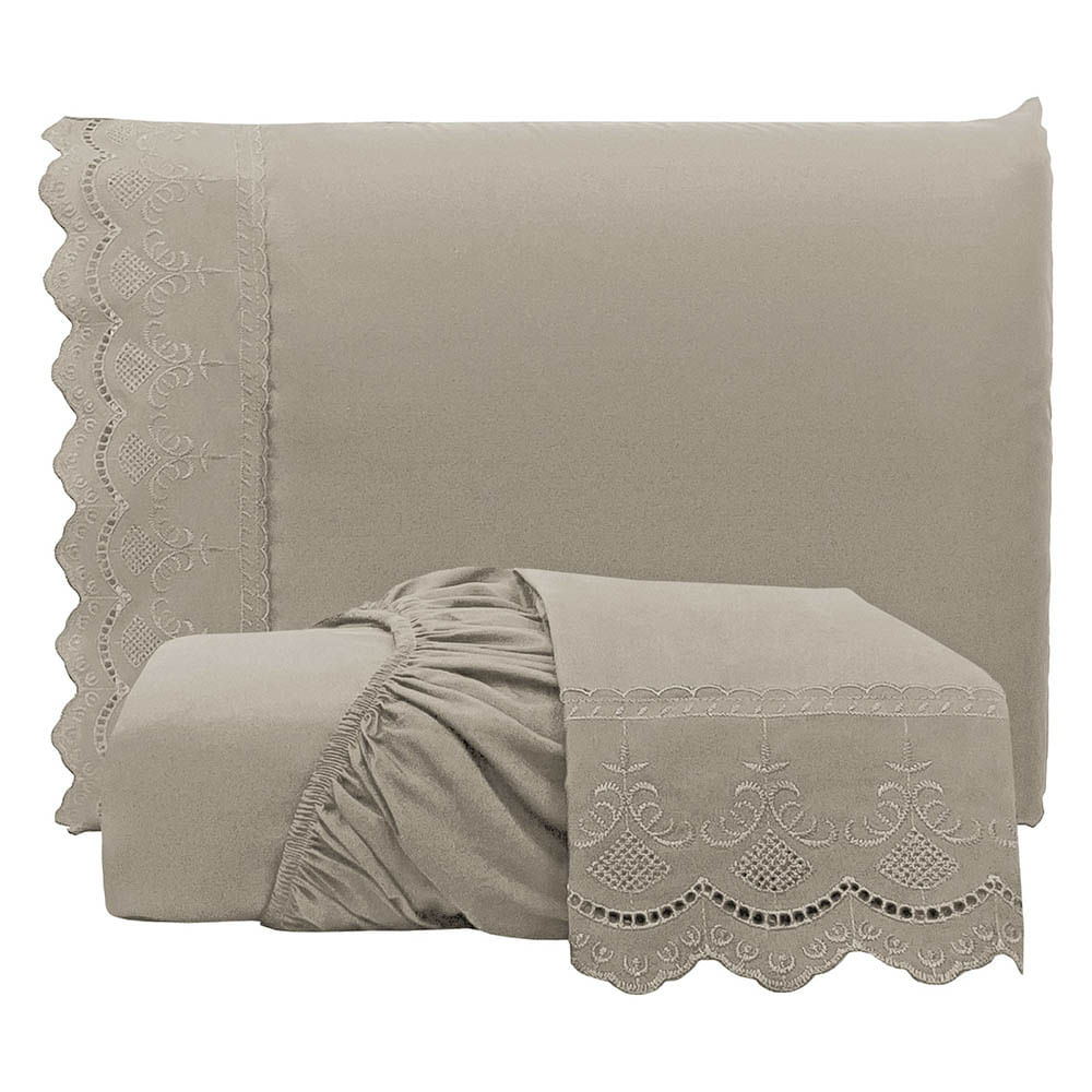 Jogo de Lençol Realce Casal 3 Peças Percal 300 Fios Bordado Inglês Macio - Fendi - 100% Poliéster