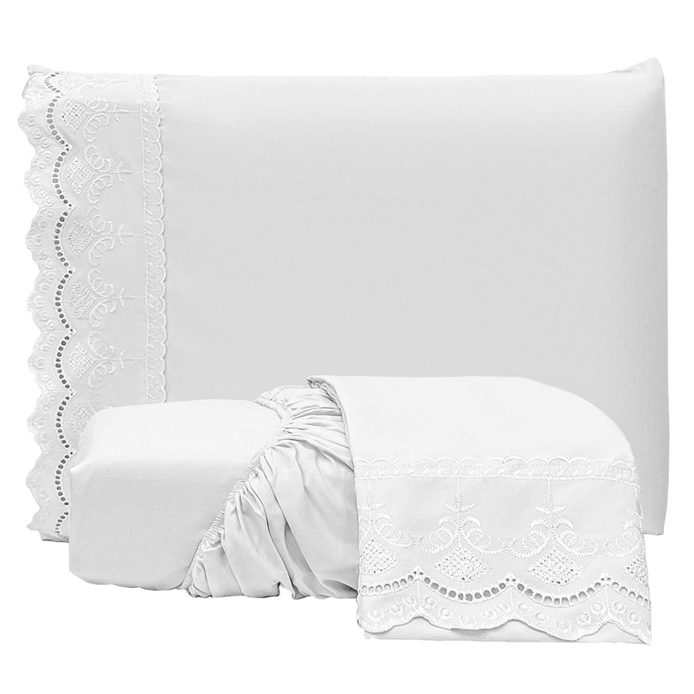 Jogo de Lençol Realce Queen 3 Peças Percal 300 Fios Bordado Inglês Macio - Branco - 100% Poliéster
