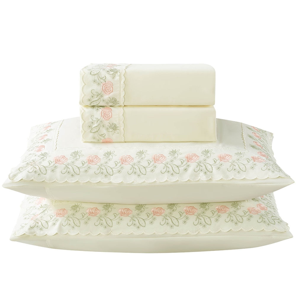 Jogo de Lençol Ricca King 4 Peças MicroPercal 300 Fios Bordado Floral - Rosas - 100% Poliéster