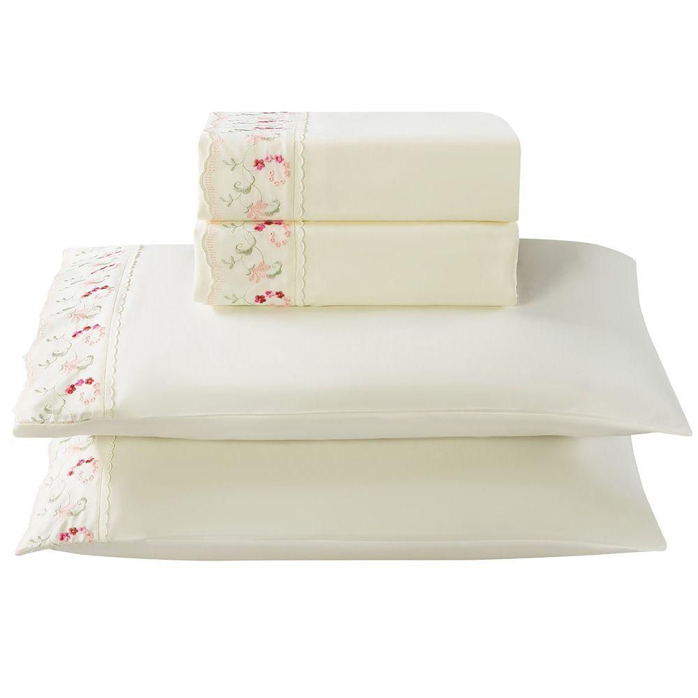 Jogo De Lençol Rosaline Casal 4 Peças Micropercal 300 Fios Bordado - Flor Rose - 100% Poliéster