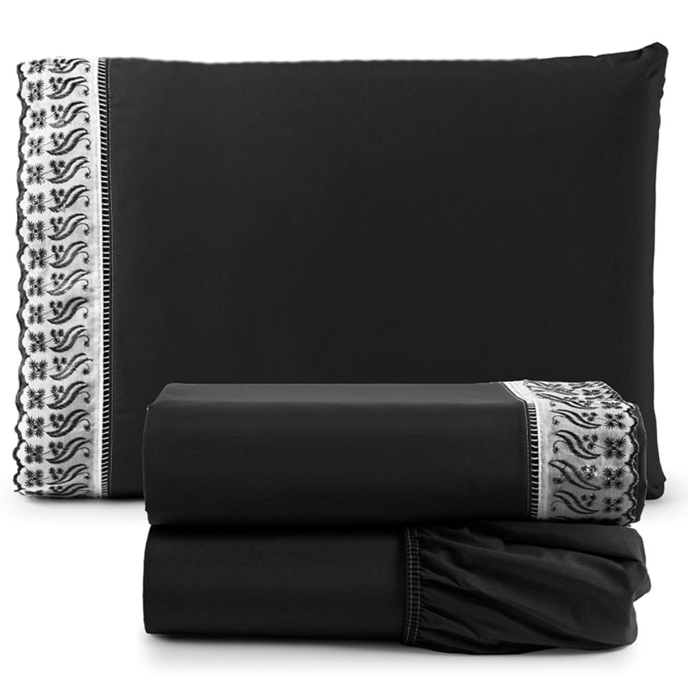 Jogo de Lençol Solteiro 3 Peças Basic Percal 180 Fios Lese Bordado Inglês - Preto