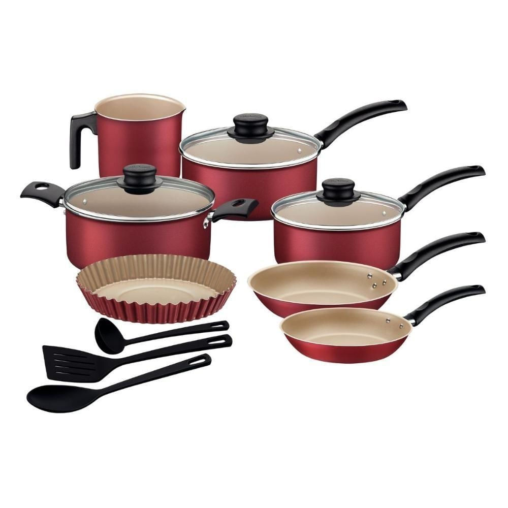 Jogo de Panelas e Utensílios Turim 10 Peças TramontinaCom revestimento interno e externo antiaderente Starflon Max este jogo de panelas vai completar sua cozinha e deixá-la apta para o preparo das mais variadas receitas. Suas peças tem corpo de alumínio e são revestidas em antiaderente Starflon Max, duas características que garantem o cozimento rápido e uniforme dos alimentos, evitam que eles grudem na superfície e as tornam mais duráveis. Seus cabos e alças são em baquelite antitérmico e seus pegadores são de nylon, reduzem a propagação de calor e proporcionam um manuseio confortável e seguro. Suas panelas e sua caçarola vem com tampas de vidro temperado com borda de aço inox, que auxiliam no preparo e facilitam a visualização da parte interior. Além de tudo isso, o jogo pode ser levado à máquina de lavar louças e ainda acompanha utensílios em nylon que não danificam o antiaderente das peças e são perfeitos tanto para a hora de preparar ou de servir suas receitas!Descrição do produtoMaterial: AlumínioCor: VermelhoLinha Comercial: TurimQuantidade: 10 PeçasRevestimento Interno: AntiaderenteTipo de Fogão: Gás, Elétrico, Vitrocerâmico - resistência elétricaMáquina de Lavar Louça: SimConteúdo:1 Caçarola 20cm 2,8L1 Panela 18cm 2L1 Panela 16cm 1,4L1 Frigideira 20cm 0,8L1 Frigideira 16cm 0,4L1 Fervedor 12cm 1,1L1 Forma para Torta 22cm 1L1 Concha 23,2cm1 Espátula 28,7cm1 Colher para Servir 28,5cmImagens meramente ilustrativas, todos os itens que ambientam o produto não estão inclusos.Cor: Vermelho | Marca: Tramontina | Fabricante: Tramontina | Origem: Nacional | Modelo: Jogo de panelas | Condição do Item: Novo | É Kit: Não | É apto para lava-louças: Sim | Código universal de produto: 7891112312159 | Linha: Turim | Regulamentação Produto Perigoso: Não aplicável | SELLER_PACKAGE_HEIGHT: 49 cm | SELLER_PACKAGE_WIDTH: 30 cm | SELLER_PACKAGE_LENGTH: 21 cm | SELLER_PACKAGE_WEIGHT: 3300 g | SELLER_PACKAGE_TYPE: Caixa | Adequado para fogão de indução: Não | É kit de fábrica: Sim | Com revestimento antiaderente: Sim | Material do cabo: Polipropileno | Peças incluídas: Panelas, Utensilios