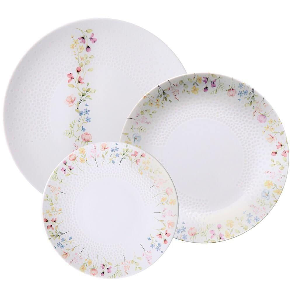 - Inspirado na delicadeza das pequenas flores coloridas, cada prato apresenta uma disposição única, combinando harmoniosamente com a textura em baixo relevo estilo póa.