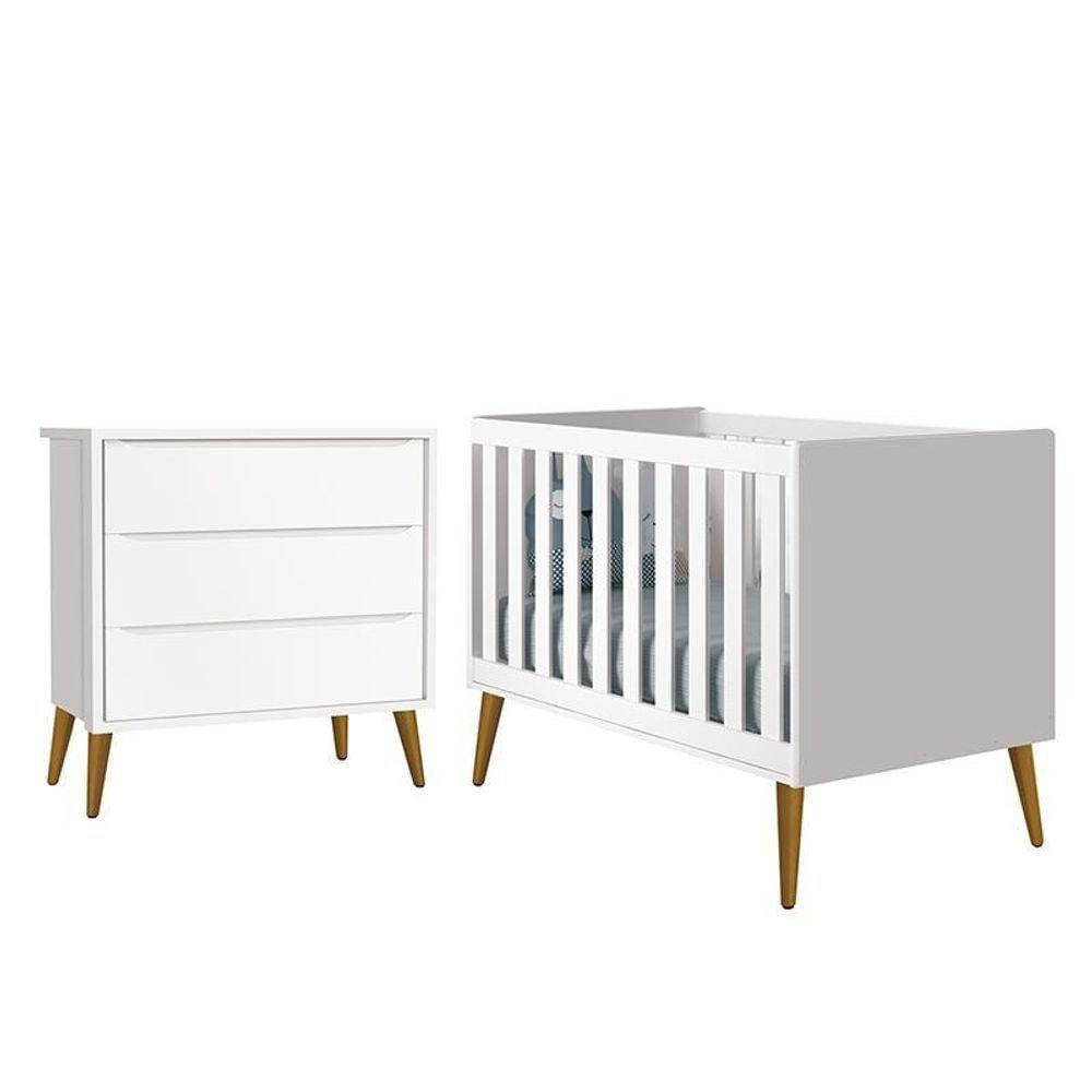 Jogo De Quarto Infantil Theo Retrô Cômoda 3 Gavetas E Berço Branco Fosco Com Pés Amadeirado - Reller Móveis Branco Fosco