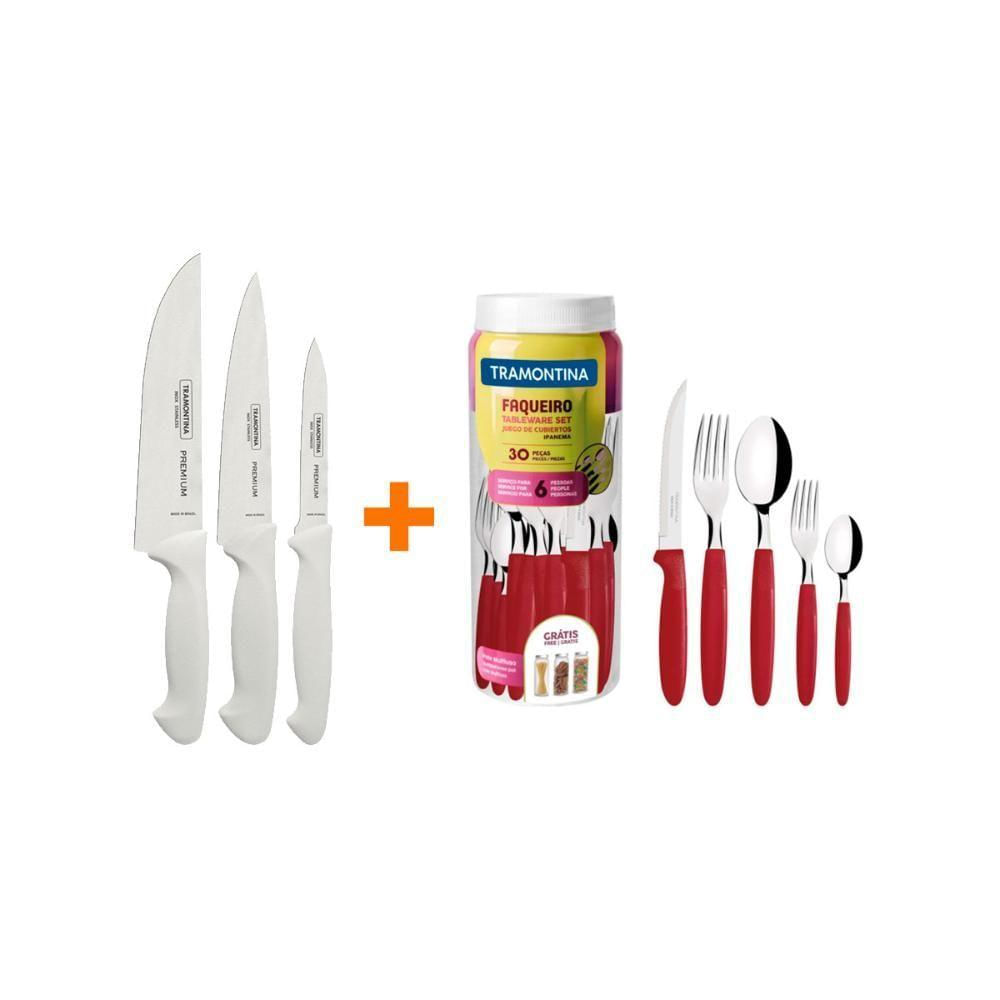 OBS: Veja na descrição os itens que acompanham o jogo. COMPONENTES DO KIT: 1 - Jogo de Faca Premium 3 PÇ - Tramontina 24499811 1 - Faqueiro Ipanema 30pç Vermelho Tramontina 23398/788 Jogo de Facas Premium com Lâminas em Aço Inox e Cabos de Polipropileno Branco 3 Peças - Tramontina 24499811 Garantia: 90 dias para vícios ou defeitos de fabricação. As lâminas de aço inox tem maior durabilidade do fio devido ao tratamento térmico. Os cabos de polipropileno possuem maior resistência e durabilidade. Podem ir à máquina de lavar louças facilitando seu dia a dia. - Cor do cabo: Branco - Material do cabo: Polipropileno - Peso Líquido: 0,20 kg. - Peso Bruto: 0,25 kg. - Medidas Embalagem: 2,0cm A x 16cm L x 38cm C - Conteúdo do jogo: 1 - 24472186 - Faca Utility Lâmina 6 (15,24cm) 1 - 24473187 - Faca para Cozinha lâmina 7 (17,78cm) 1 - 24470184 - Faca para Frutas e Legumes Lâmina 4 (10,16cm)