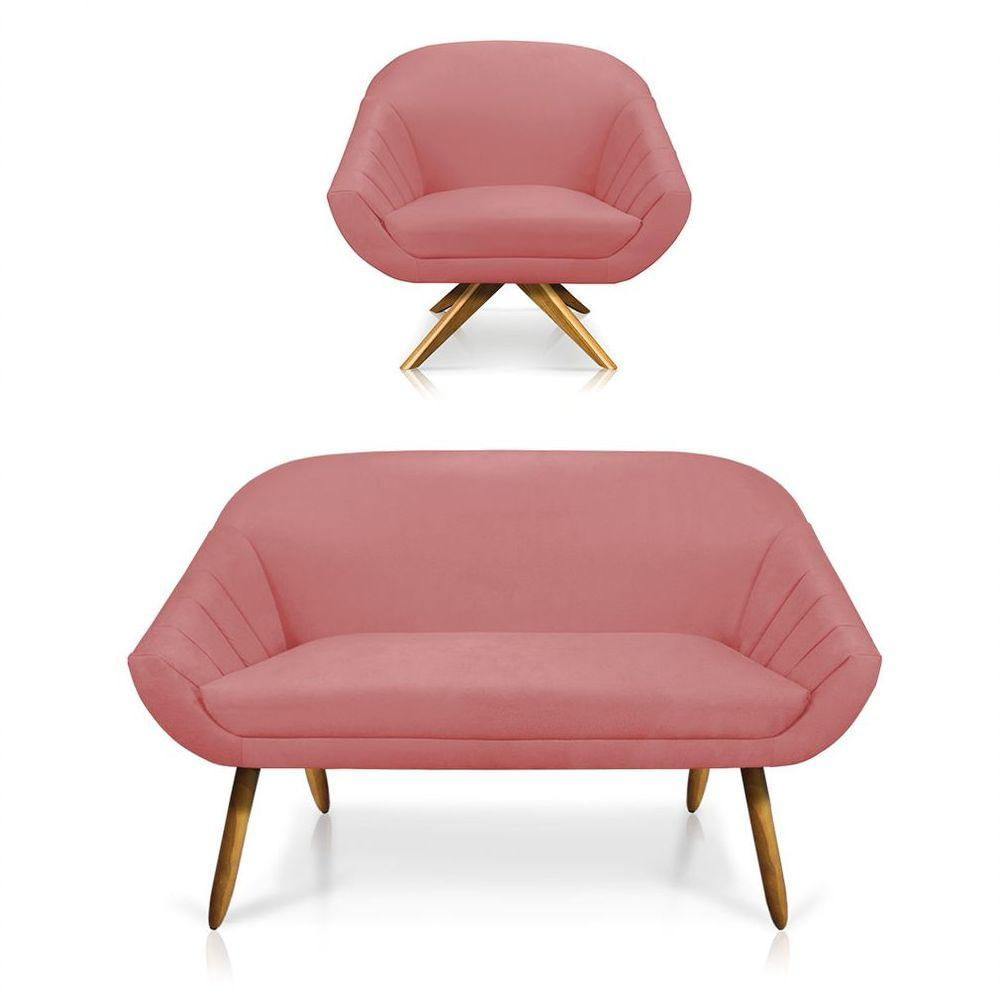 Kit 01 Namoradeira 02 Lugares E 01 Poltrona Giratória Giovana Suede Rose Base Madeira Ma30 - D'rossi