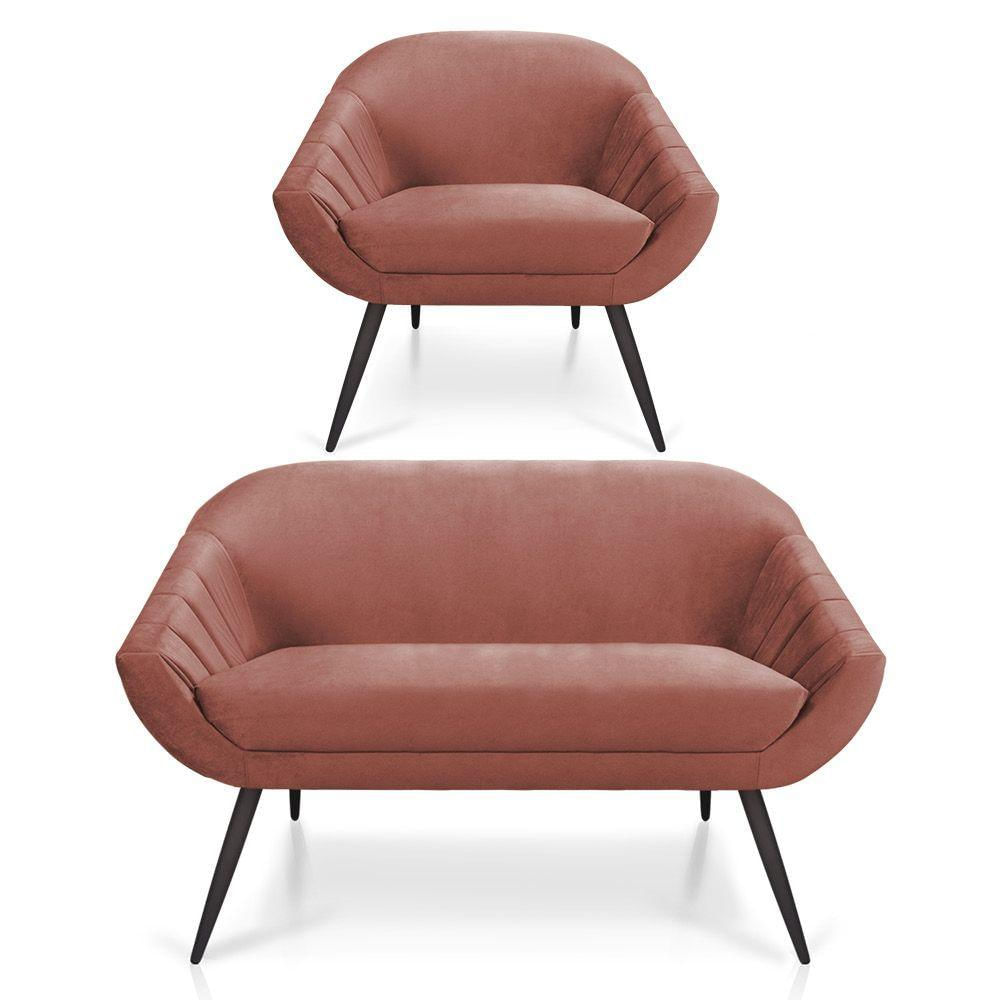 Kit 01 Namoradeira 02 Lugares E 01 Poltrona Giovana Veludo Pés Palito De Ferro Rose