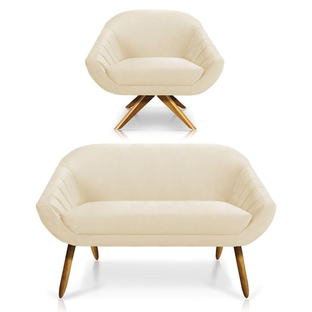 Kit 01 Namoradeira 02 Lugares E 01 Poltrona Giratória Giovana Veludo Bege Base Madeira