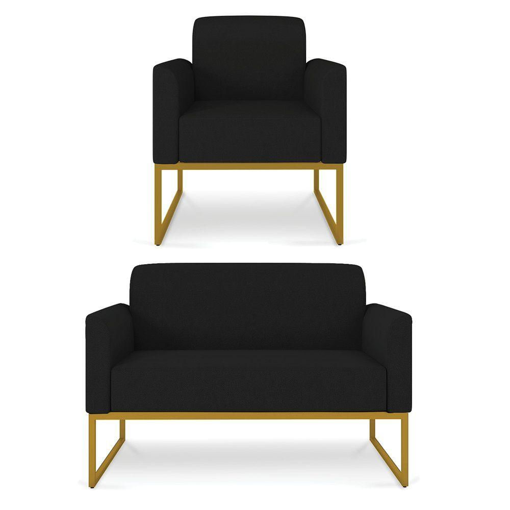 Kit 01 Namoradeira 02 Lugares E 01 Poltrona Marisa Linho Base Industrial Metálica Dourado - D'rossi Cor A79 Preto