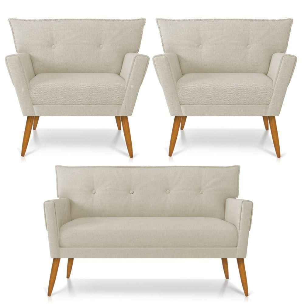 Estrutura:Madeira Eucalipto Espuma:D-23 Tecido:Linho (60% Algodão 40% Poliéster) Tipo de pés:Pés Palito Peso suportado:Até 120 Kg Garantia:90 dias contra defeito de fabricação Montagem:O produto vai montado, apenas rosquear os pés Instruções de limpeza:Utilizar um pano limpo e levemente úmido Você irá receber:03 Volumes com 01 Namoradeira e 02 Poltronas