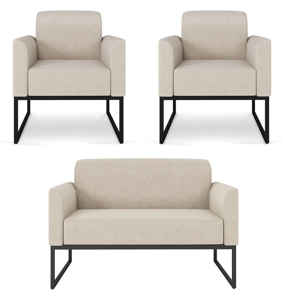 Kit 01 Namoradeira 02 Lugares E 02 Poltronas Marisa Linho Areia A27 Base Industrial Metálica Preto