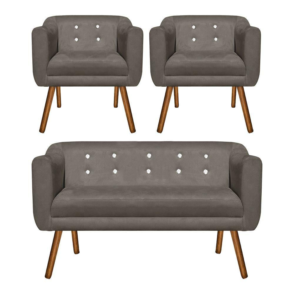 Kit 01 Namoradeira e 02 Poltronas Julia Suede Marrom Rato Com Strass Pés Palito Drossi