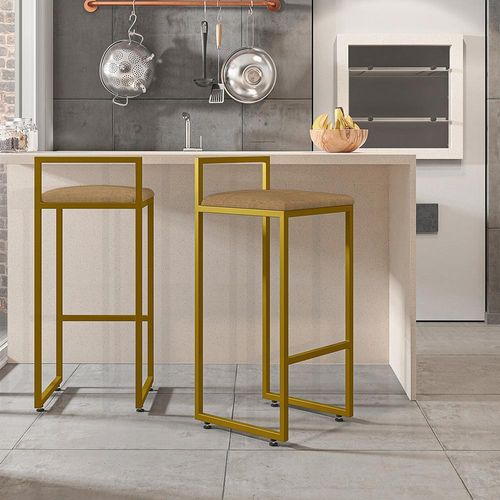 Kit 02 Banquetas Alta Para Cozinha Sala De Jantar Hanna L02 Dourado Linho Bege Escuro - Lyam Decor