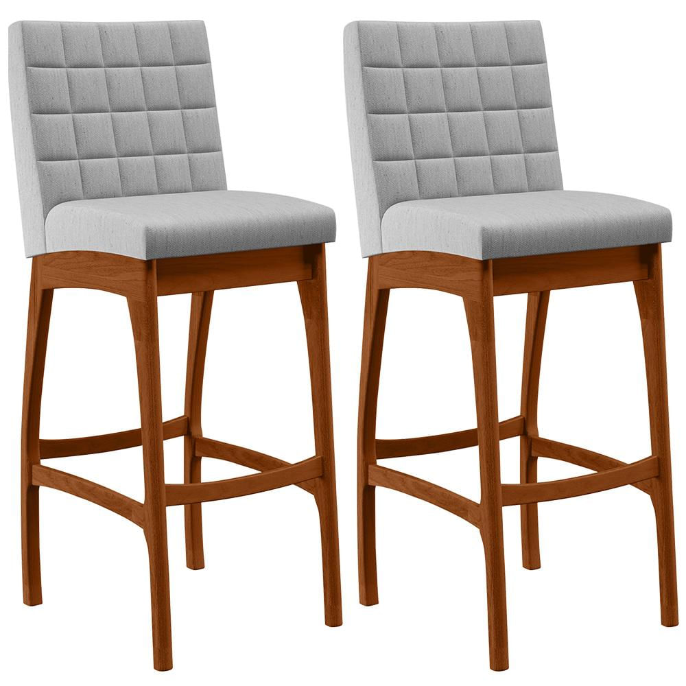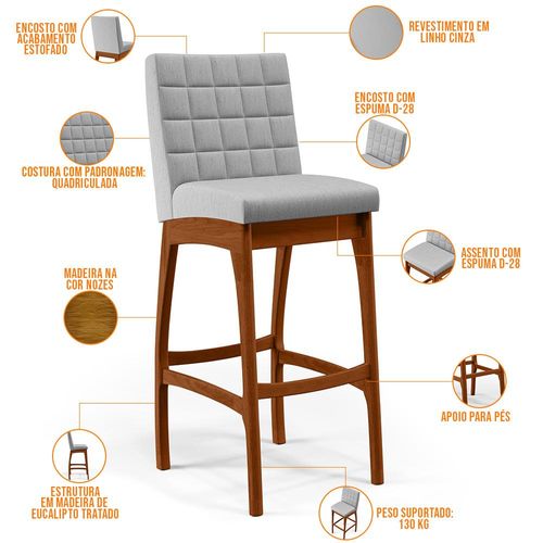 Entregando muita excelência, o Kit 02 Banquetas Altas Para Cozinha Sala de Jantar Fixa Mila B04 Linho Cinza - Lyam Decor é o complemento que faltava para deixar sua casa ainda mais extraordinária. Seu encosto com costura em padrão quadriculado e assento estofados, centralizam em si uma graciosidade estonteante, sem perder todo o seu conforto. A estrutura em madeira, na cor nozes, também é digna de notoriedade, por imprimir bastante personalidade a sua decoração. Vale ressaltar ainda, o apoio para os pés que garante maior segurança à mesma.