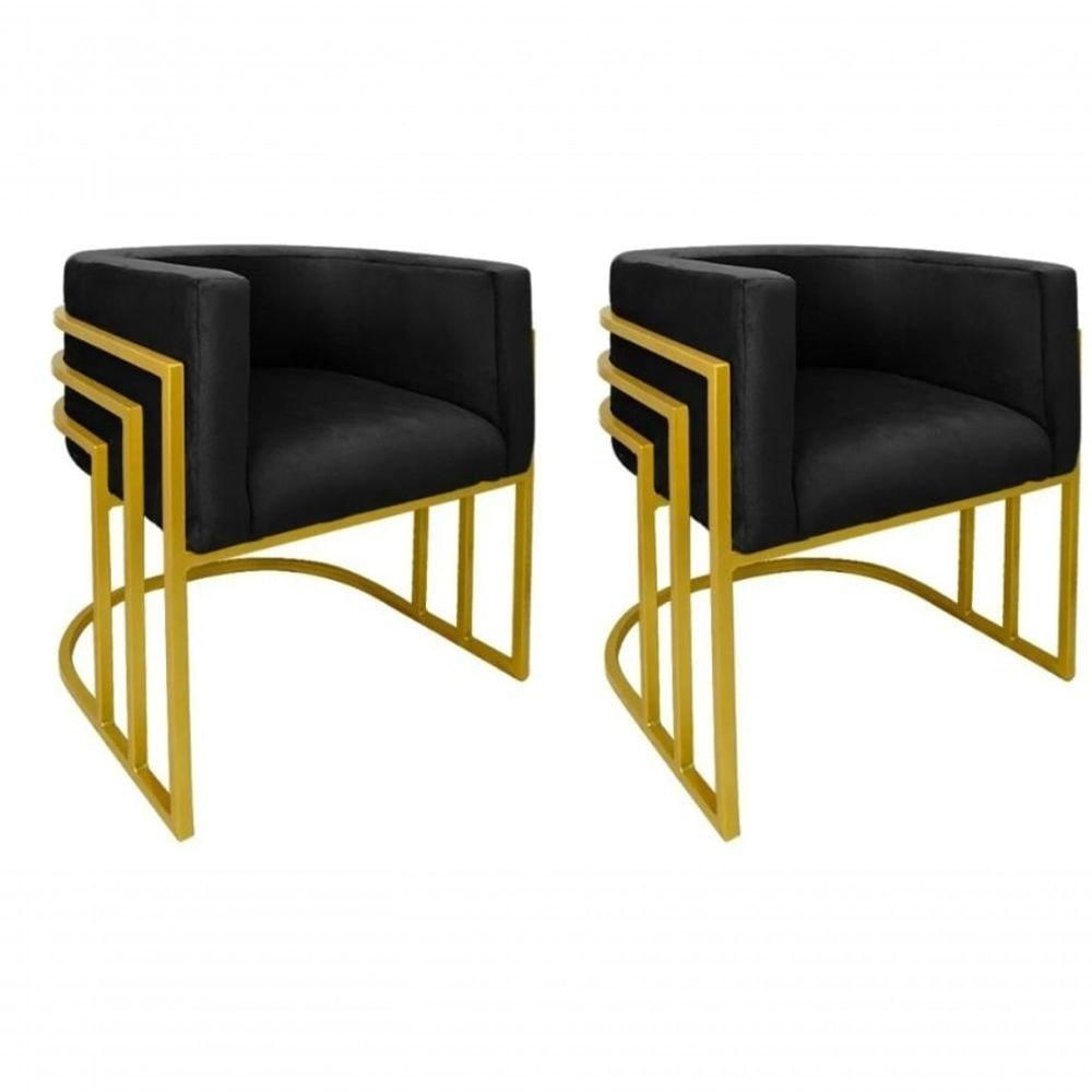 Kit 02 Cadeiras Poltrona Luxo Base De Metal Tripla Dourado Sala De Jantar Cozinha Recepção Veludo Preto Eli Móveis