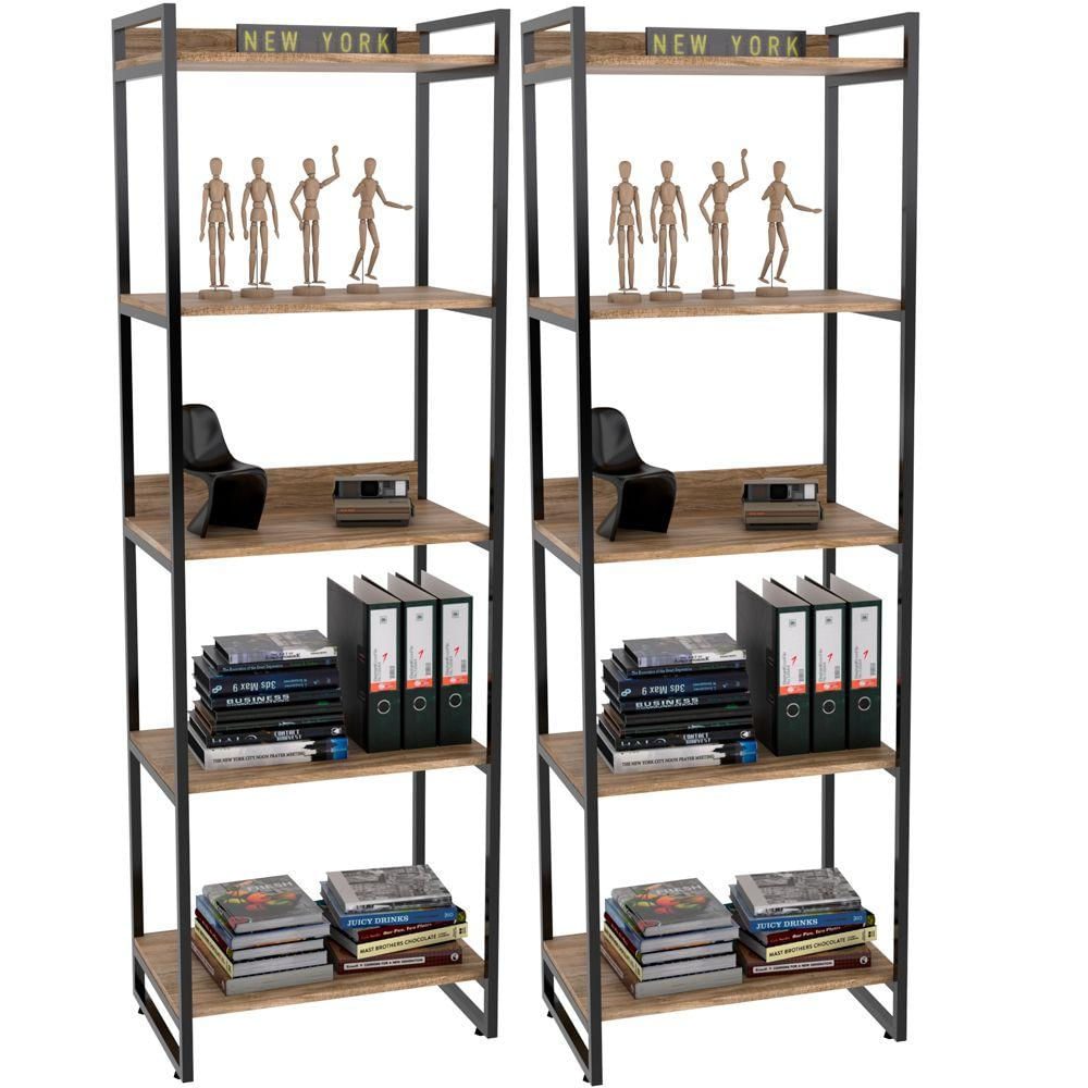 Kit 02 Estantes com 5 Prateleiras Escritório Estilo Industrial Form C01 187x60 cm Carvalho - Lyam Decor
