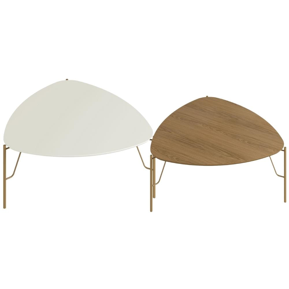 Combinando o formato triangular com cantos arredondados e pés metálicos industriais, esse duo oferece versatilidade e estilo para sua sala de estar. A mesa de centro alta funciona como apoio prático para drinks e objetos decorativos, enquanto a mesa de centro baixa cria um visual equilibrado e moderno. Juntas, formam uma composição dinâmica que se adapta a qualquer layout - do minimalista ao eclético.