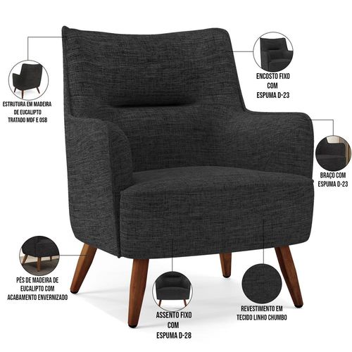 Quando o assunto é elegância, o Kit 02 Poltronas Decorativa Fixa Pés de Madeira Isabella D02 Linho Chumbo D-465 - Lyam Decor apresenta todos os requisitos esperados! Com detalhes inigualáveis, ela se encarrega de trazer todo o charme e elegância que sua sala precisa! A riqueza nos detalhes de acabamento, contribuem para que ela seja o destaque! Robusta, resistente e confortável, é a somatória da beleza com o conforto que você precisa! Conta ainda com os pés em madeira, trazendo ainda um ar mais moderno. Leve agora a sua! Dimensões do produto (L x A x P) 75 x 85 x 78 cm Medidas Internas: Altura do Assento: 45 cm Profundidade Livre do Assento: 48 cm Largura do Assento: 49 cm Altura livre do Encosto: 50 cm Largura do Braço: 13 cm Altura do Braço ao assento: 21 cm Altura dos Pés: 25 cm Características: Estrutura em madeira reflorestada de eucalipto tratado, MDF ou OSB, unidas com grampos galvanizados. Revestimento em tecido Linho Chumbo. Assento Fixo com espuma D-28 Sobre Percintas elásticas. Encosto Fixo com espuma D-23 Sobre Percintas elásticas. Braço Espuma D-23. Suporta até 100 kg. Pés de madeira de eucalipto com acabamento envernizado. Sua limpeza deve ser feita com pano úmido e água limpa, sem esfregar. Nunca sentar nos braços ou encosto do produto. - Por se tratar de estofado as medidas podem ter uma pequena variação de até 3 cm.- A tonalidade do produto real poderá ter ligeira variação devido o lote de tecidos.Observações importantes: - Produto para uso residencial em ambiente interno, não devendo ficar exposto diretamente ao sol, calor e umidade excessivos. - Pode haver alguma diferença de tonalidade entre a imagem e o produto real, por conta do tratamento de imagens e a calibração de cores do seu monitor. - As imagens são meramente ilustrativas, não acompanham objetos de decoração e eletrônicos. - Ao receber a mercadoria, o cliente deve verificar as condições da embalagem, caso haja alguma avaria não assine o comprovante de recebimento. - Montagem, desmontagem e outras instalações serão de responsabilidade do cliente. Não nos responsabilizamos, no ato da entrega, por subir escadas/elevadores ou pelo transporte por guincho em apartamentos. Eventuais despesas são de responsabilidade do comprador. - Confira as dimensões do produto e certifique-se de que passará normalmente por supostos elevadores, portas, escadas e/ou corredores de sua residência.