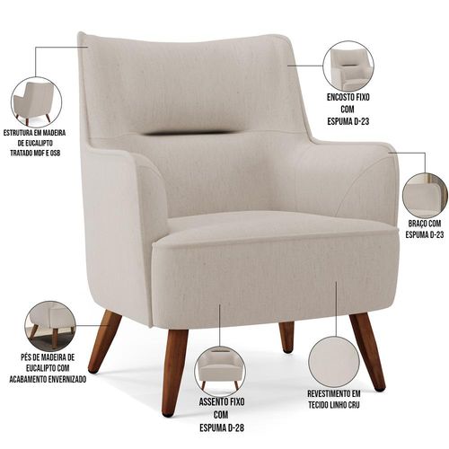 Características: Estrutura em madeira reflorestada de eucalipto tratado, MDF ou OSB, unidas com grampos galvanizados. Revestimento em tecido Linho Cru. Assento Fixo com espuma D-28 Sobre Percintas elásticas. Encosto Fixo com espuma D-23 Sobre Percintas elásticas. Braço Espuma D-23. Suporta até 100 kg. Pés de madeira de eucalipto com acabamento envernizado. Sua limpeza deve ser feita com pano úmido e água limpa, sem esfregar. Nunca sentar nos braços ou encosto do produto.