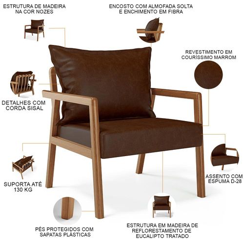 O Kit 02 Poltronas Decorativa Para Sala de Estar e Living Alícia B04 Couríssimo Marrom é perfeito para adicionar um toque de estilo moderno a sua sala de estar. Com sua estrutura em madeira maciça envernizada, essa poltrona de madeira traz durabilidade e elegância para o ambiente. O assento estofado e revestido com materiais de qualidade oferece conforto excepcional, permitindo que você relaxe com estilo. Já o design moderno combina perfeitamente com qualquer tipo de decoração, tornando-a uma escolha versátil para qualquer sala de estar, living, recepção, escritório e diversos outros ambientes. A cereja do bolo fica por conta do detalhe da corda trançada no encosto com a almofada sobreposta, um charme à parte.
