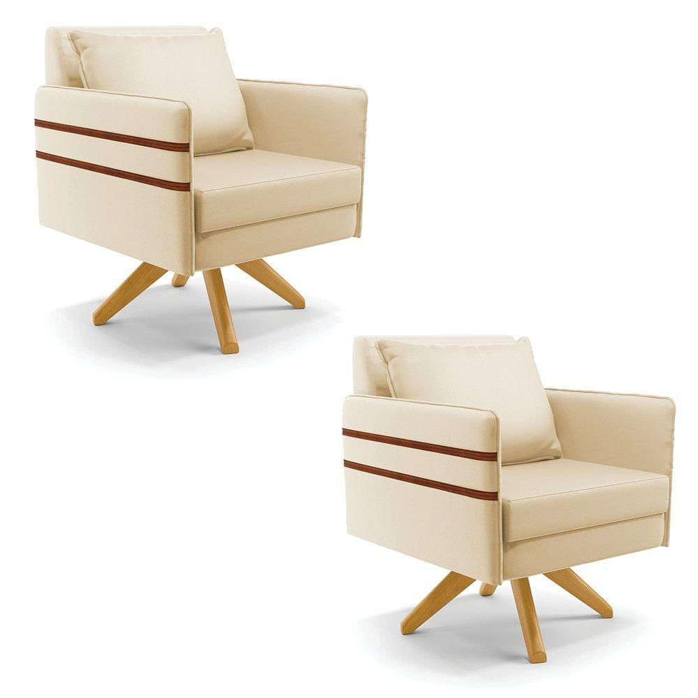 Kit 02 Poltronas Giratória Corino Bege Base De Madeira Ma30