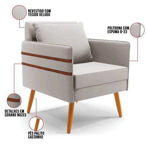 Estrutura:Madeira Eucalipto Espuma:D-23 Tecido:Veludo Tipo de pés:Pés Palito Castanho Peso suportado:Até 120 Kg Garantia:90 dias contra defeito de fabricação Montagem:O produto vai montado, apenas rosquear os pés Instruções de limpeza:Utilizar um pano limpo e levemente úmido Você irá receber:02 Volumes com 02 Poltronas