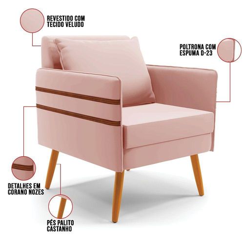Estrutura:Madeira Eucalipto Espuma:D-23 Tecido:Veludo Tipo de pés:Pés Palito Castanho Peso suportado:Até 120 Kg Garantia:90 dias contra defeito de fabricação Montagem:O produto vai montado, apenas rosquear os pés Instruções de limpeza:Utilizar um pano limpo e levemente úmido Você irá receber:02 Volumes com 02 Poltronas