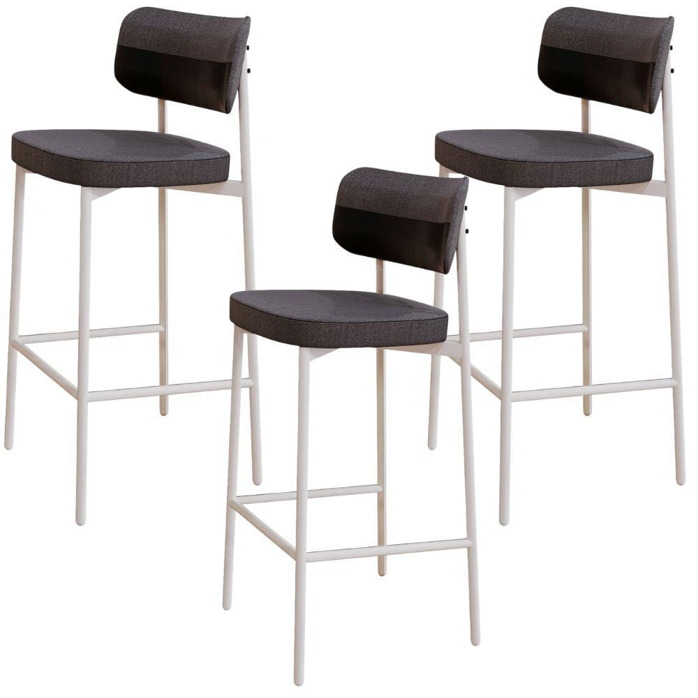 Kit 03 Banquetas Alta Bar Cozinha Sala De Jantar Aço Branco Kaira C01 Linho Preto Courino Preto - Lyam Decor