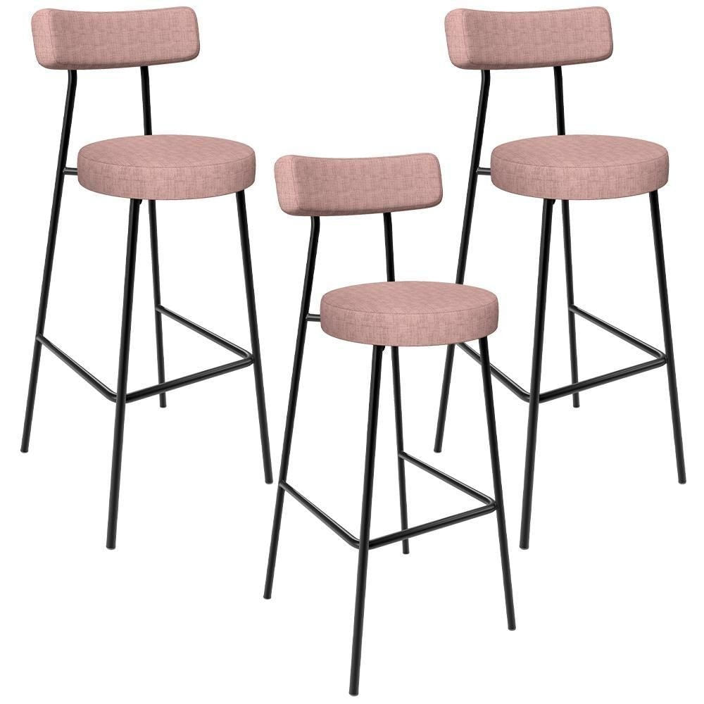 Kit 03 Banquetas Alta Bar Cozinha Sala De Jantar Aço Milão L02 Linho Rosa - Lyam Decor