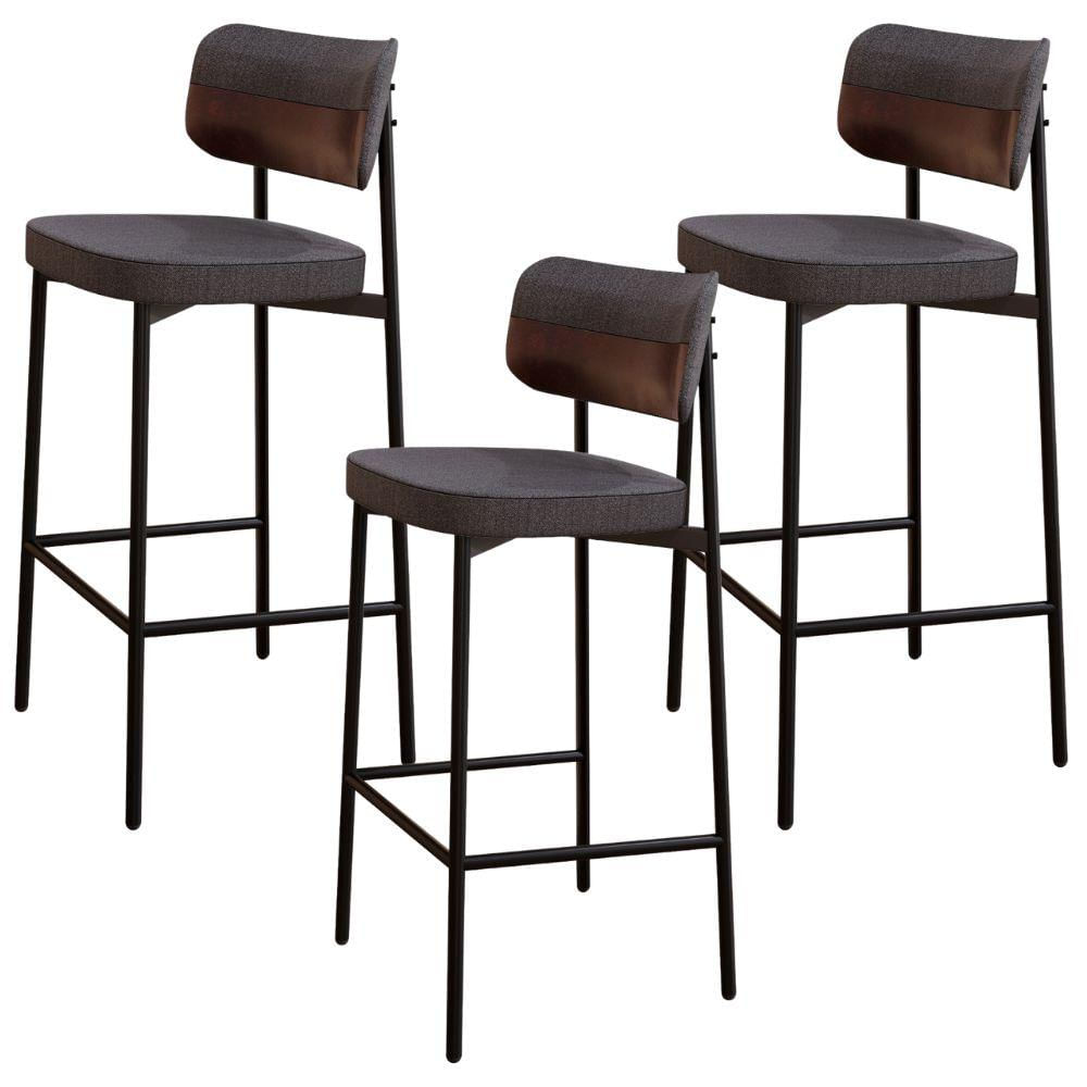 Kit 03 Banquetas Alta Bar Cozinha Sala De Jantar Aço Preto Kaira C01 Linho Preto Courino Café - Lyam Decor