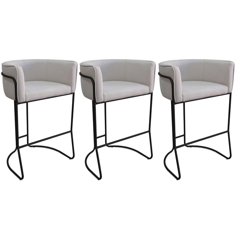 Kit 03 Banquetas Alta Com Encosto Betina Base Preto Linho Gelo - Nexta Casa