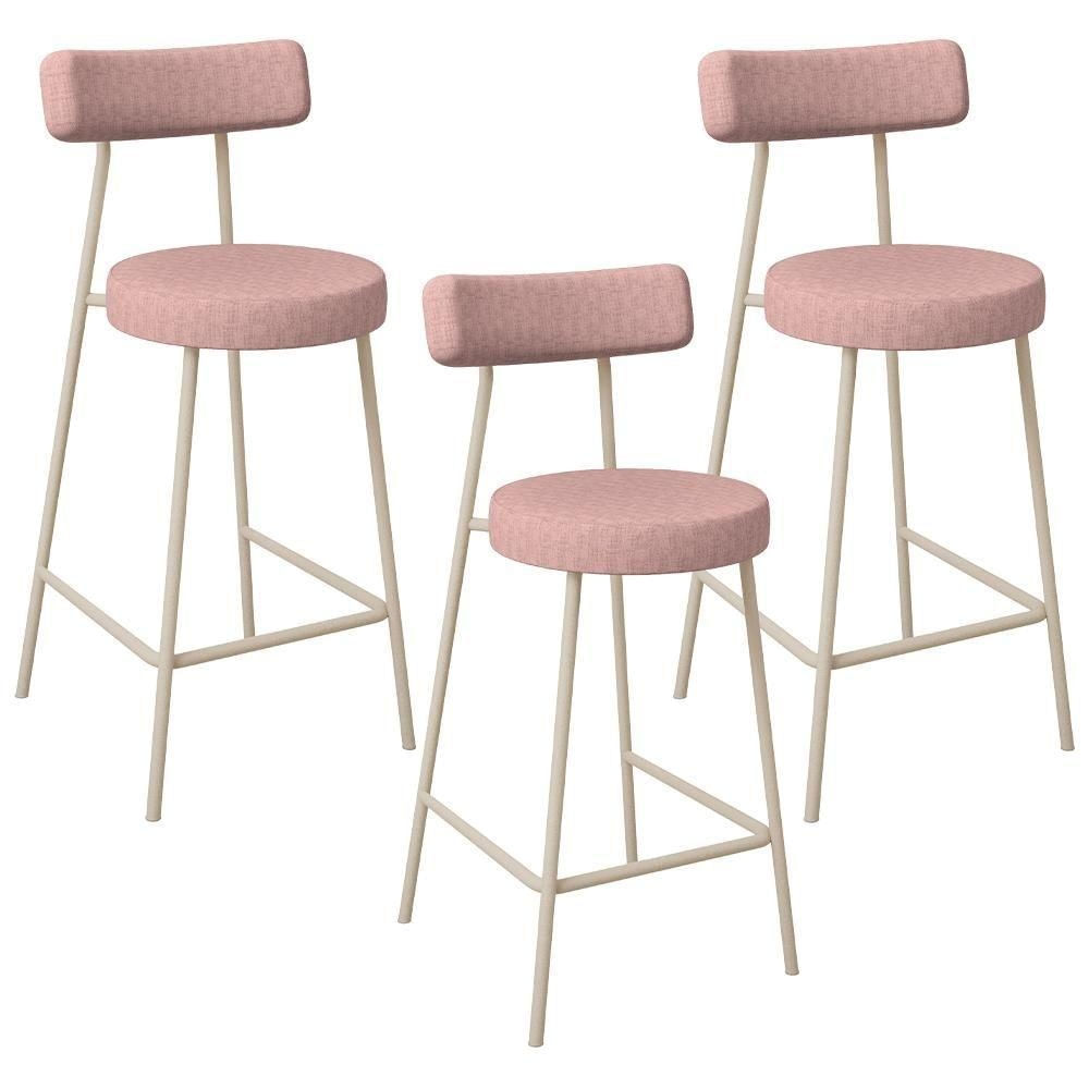 Kit 03 Banquetas Baixa Bar Cozinha Sala De Jantar Aço Milão Arena L02 Linho Rosa - Lyam Decor