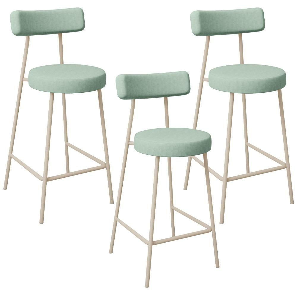 Kit 03 Banquetas Baixa Bar Cozinha Sala De Jantar Aço Milão Arena L02 Linho Verde Menta - Lyam Decor