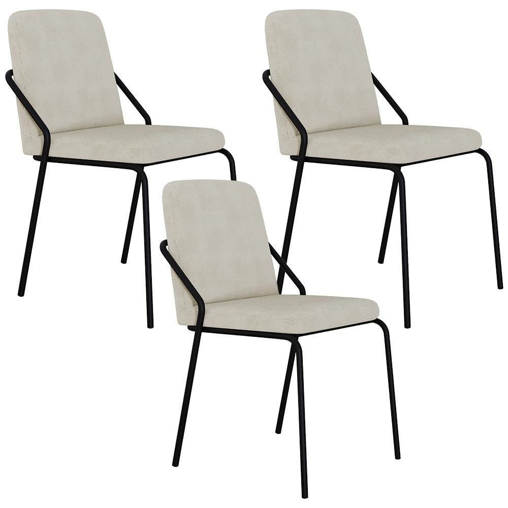 Kit 03 Cadeiras Estofada Para Sala De Jantar Loft Preto C01 Bouclê Vanilla - Lyam Decor
